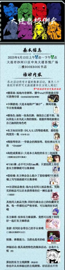 下面说点编者的个人经验,比如沈航不允许学生社团运营官方自媒体账号,这会严重影响社团通过线上渠道的纳新宣传工作,且沈航要求加入社团的成员必须实名,这也会让一些同好产生抵触情绪。在当前国内大环境的背景下,东方project很可能会被一些“老保”扣上“日本文化入侵”的帽子,而大多数学校的校领导多少会沾一点这种思想(比如一些高校动漫社不允许cos日本角色等),所以编者不建议将高校车万社团“转正”。